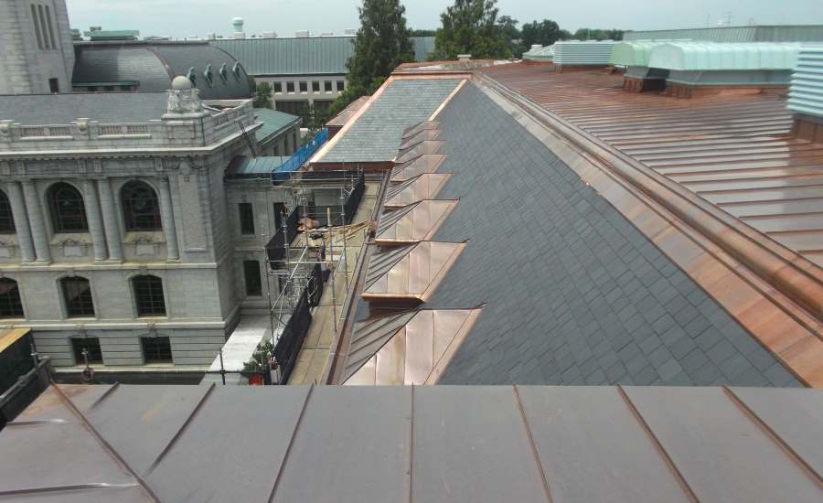 A historic town hall received a copper standing-seam roof matching the original design. Copper, a durable and recyclable metal, preserves the heritage design while offering longevity, fire resistance, and low maintenance.